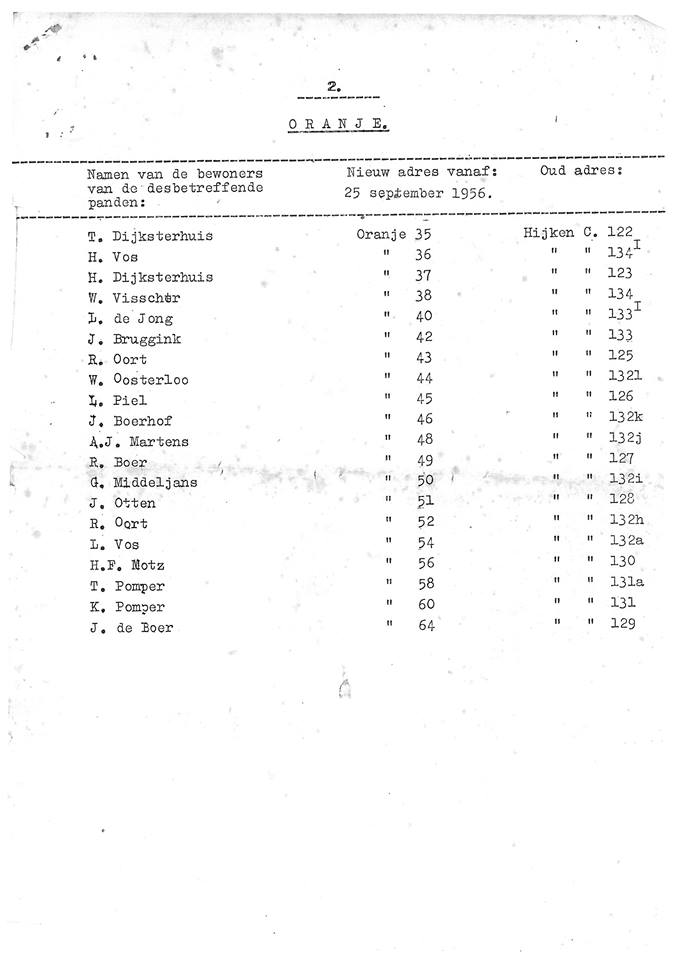 | Namen bewoners | Nieuw adres vanaf 25 september 1956 | Oud adres |